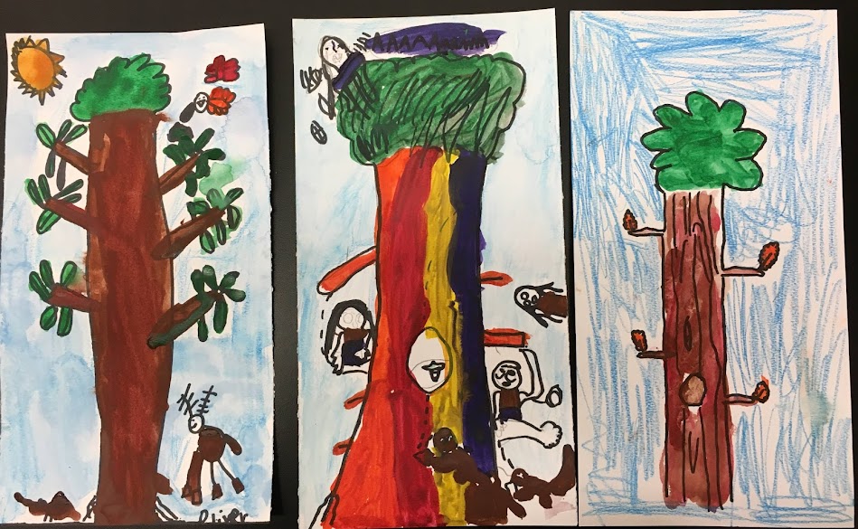 | Ms. Havner read a book about trees and they drew some. Later in the week they add the watercolor in my class. I love how kids represent trees. |