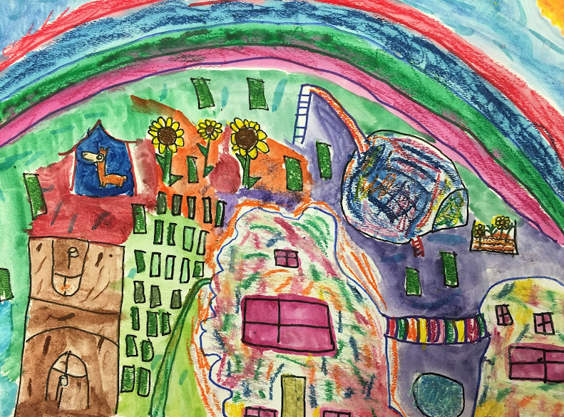 The sky color was determined by the color of the background paper. Different classrooms used different paper color. We had a lesson on color theory (a pps standard for 2nd grade) and chose the sky color according to a "primary palette" (red, yellow, blue) or a "secondary color palette" (orange, green, purple).